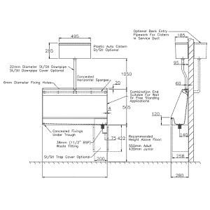 If the cistern is to be concealed behind panels or a wall, the water connection to the urinal can be specified to enter from the rear of the trough. If "rear-entry" is not specified, a top-entry version of the urinal will be supplied for use with a cistern fixed directly above, not behind, the urinal.