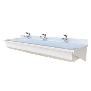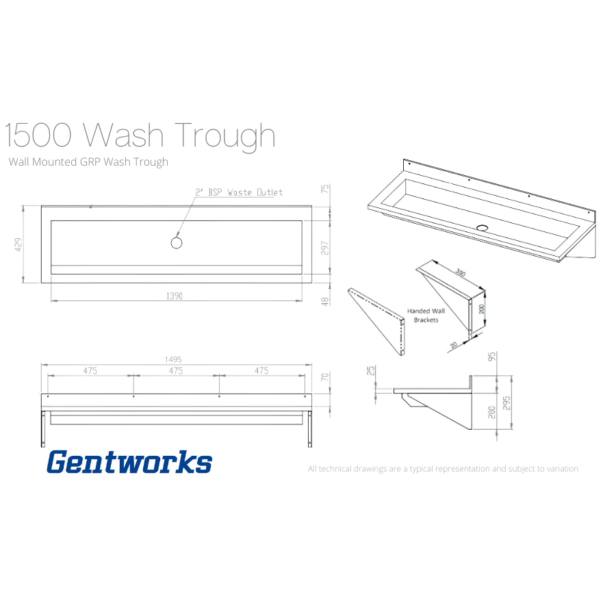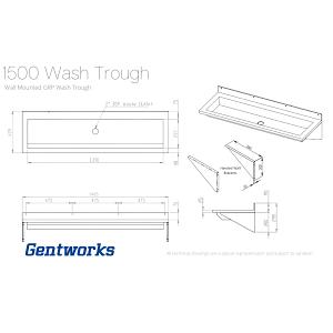 Gentworks 1500 GRP Wash Trough wall hung with Tap Deck Manufactured in Glass Fibre Reinforced Polyester Resin (the same material as often used for boat hulls), this wash trough has a smooth gel-coat finish that is resistant to staining and damage. Its smooth design enables easy cleaning without the requirement for strong cleaning products. The Gentworks GRP wash troughs are ideal for use in washrooms where aesthetics are important. They are particularly popular in the education sector and for modular buildings. • Tap ledge for deck mounted taps Tap Holes: Now supplied without tap holes, these can easily be drilled on site as part of the installation. Dimension: Pack Includes: